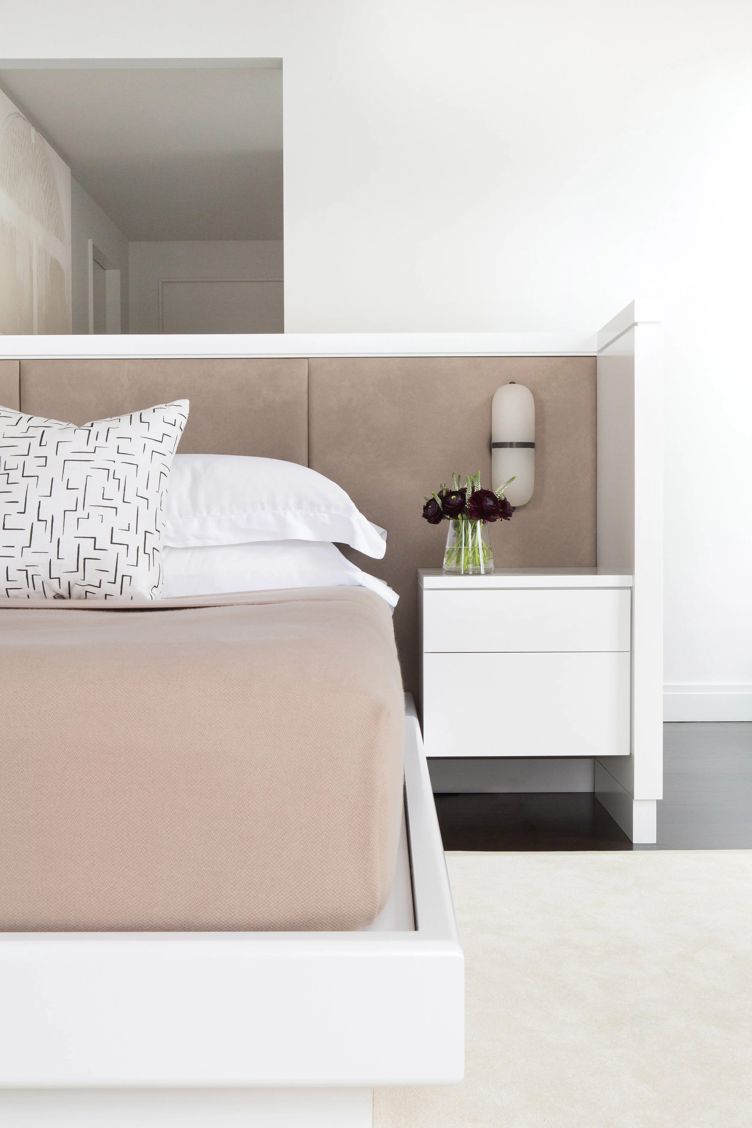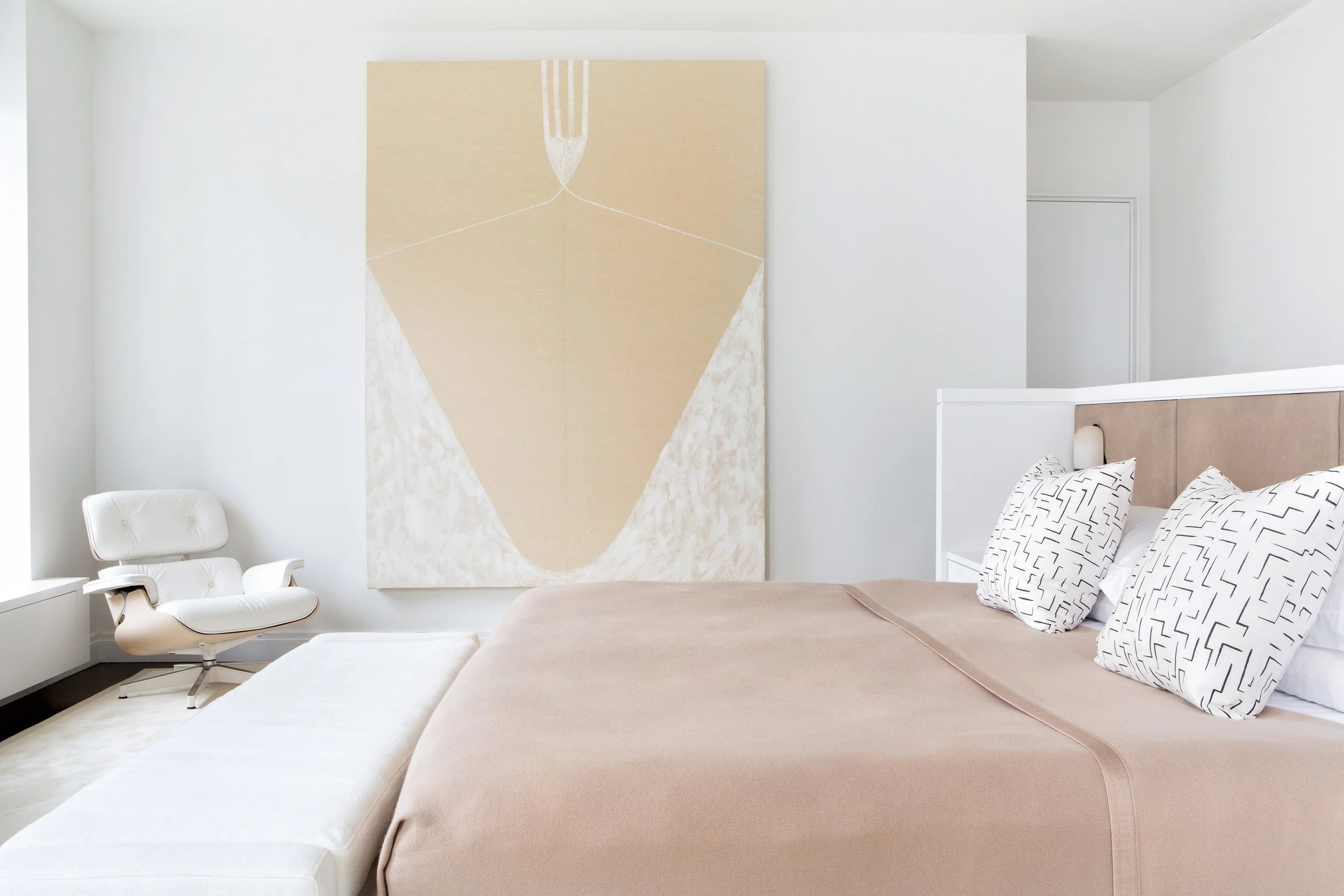 The walls, finished in polished plaster, add a touch of subtle comforting glow. This choice of material not only enhances the room but also draws the eye to the sculptural elements of the space. The combination of the custom headboard and the plaster wall finish creates a bedroom that is a haven of warmth contemporary design.
