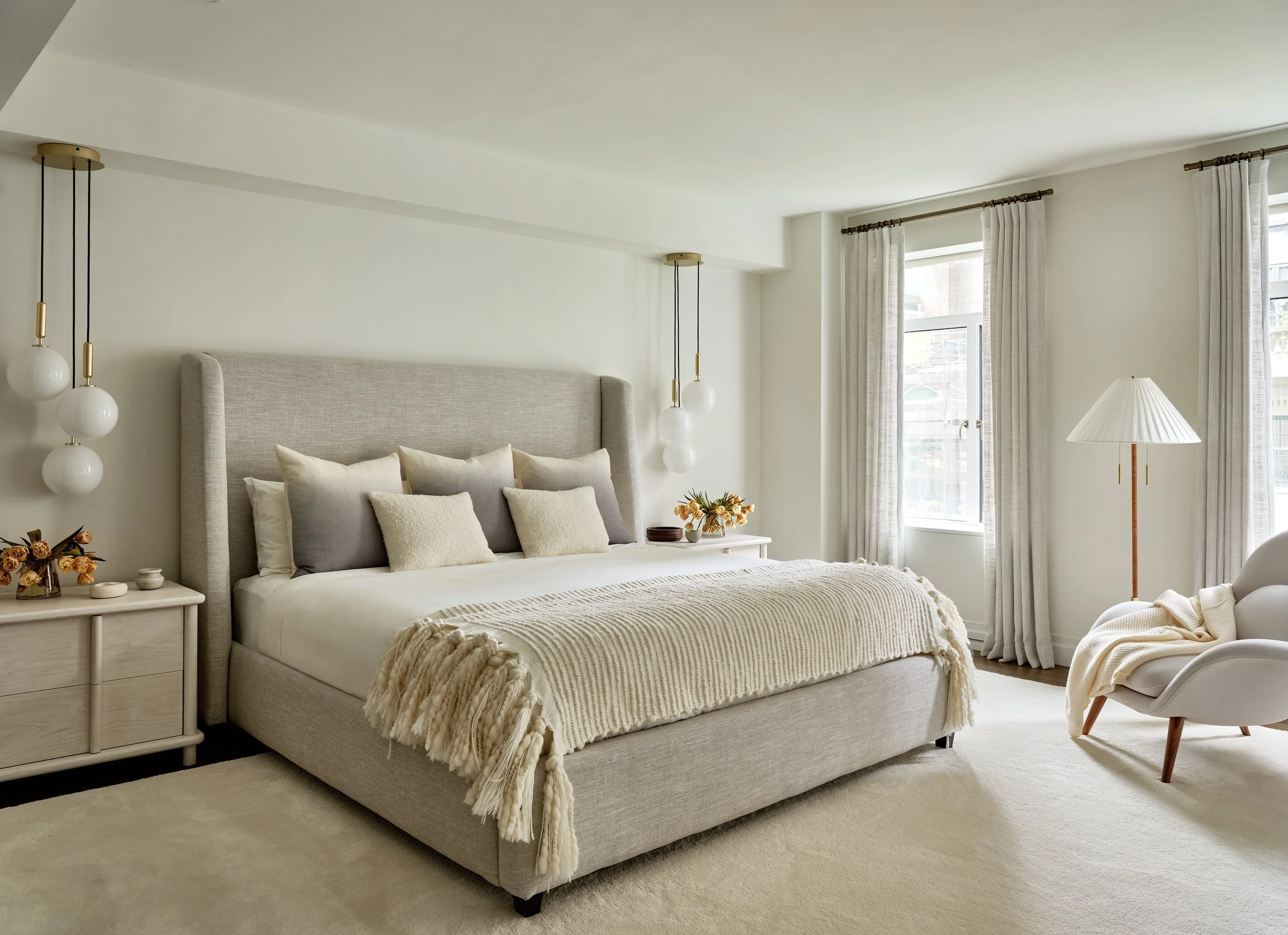 This primary bedroom, by Chango & Co., mirrors the essence of its location at Park Ave through its careful selection of organic and textural materials. The room's charm is highlighted by the harmonious blend of traditional lighting fixtures and sleek, modern furniture. The interplay of various textures throughout the space not only adds depth but also creates a warm, inviting space. This thoughtful combination of classic and contemporary elements exemplifies a sophisticated yet comfortable bedroom.