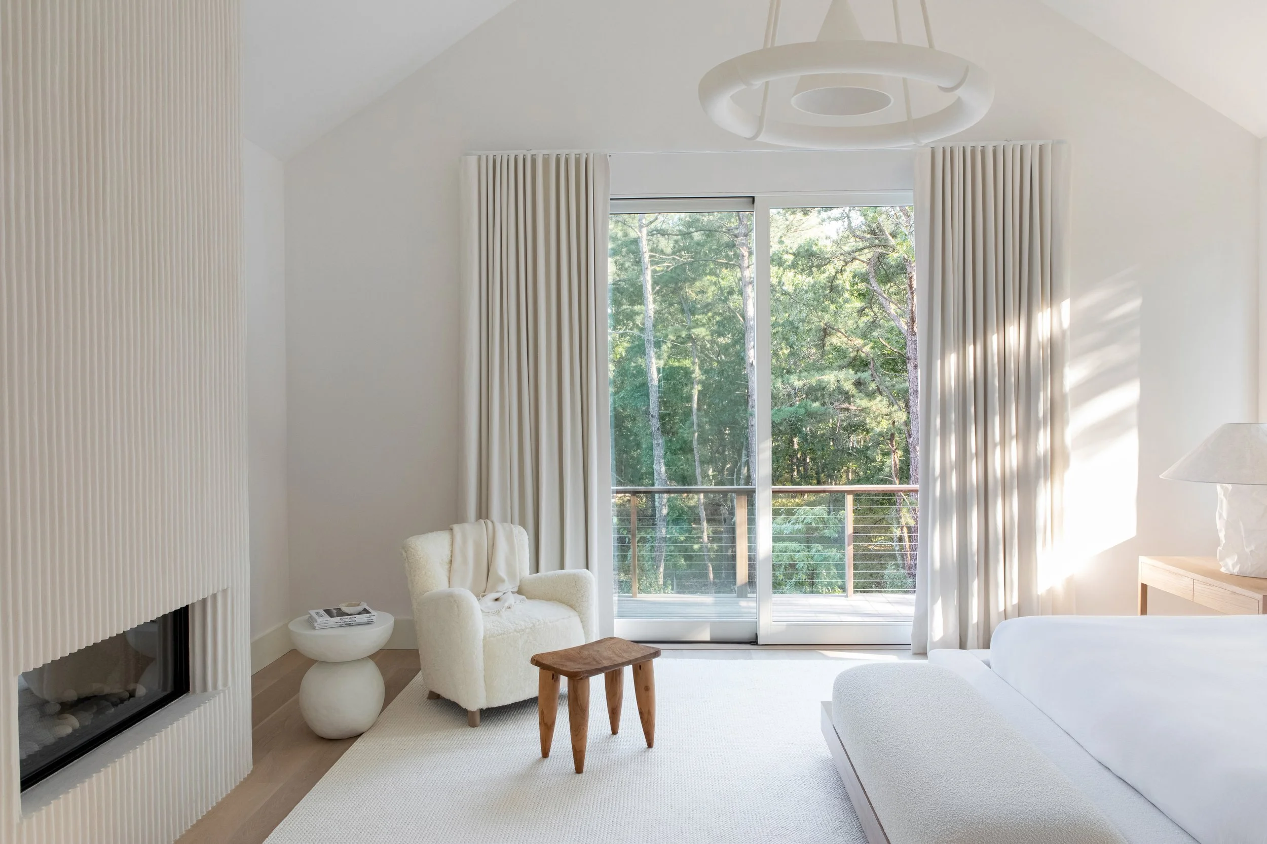 Large curtains in a gentle cream hue frame the window, softening the abundance of natural light, further enhancing the quiet, reflective mood. Below, a textured rug anchors the space. Every element in this bedroom, from the furniture to the textiles is restful simplicity.